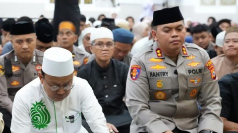 Dengan peci hitam rapi di kepala dan seragam cokelat dinas lengkap, Kapolres Fantry menyambut Ustad Das’ad Latif di panggung. Sapaan hangat itu sederhana, tapi penuh simbol: negara hadir, keamanan terjaga, kegiatan keagamaan tetap khidmat.