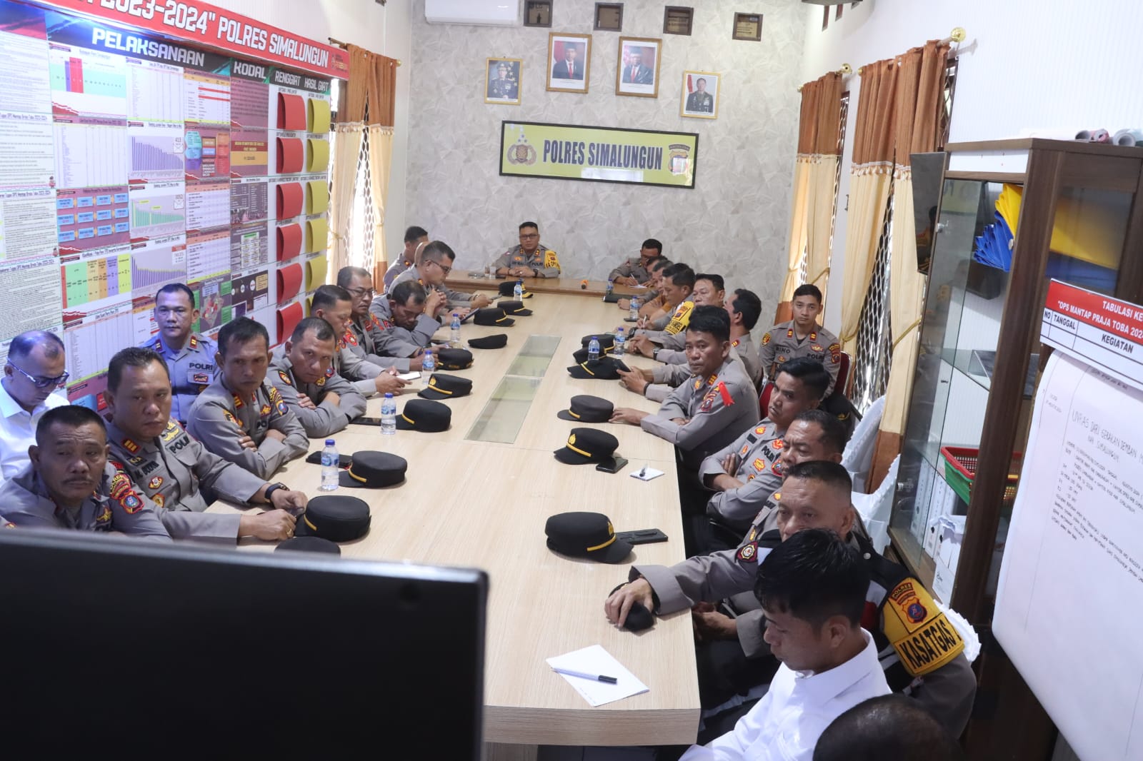 JURNALPOLRI.COM- Simalungun- Sumut- 28 Agustus 2024 – Kapolres Simalungun AKBP Choky Sentosa Meliala, S.I.K., S.H., M.H., bersama jajarannya mengikuti arahan dari Kapolda Sumatera Utara, Inspektur Jenderal (Irjen) Whisnu Hermawan Februanto, S.I.K., M.H., dalam rangka Analisa Evaluasi (Anev) Pelaksanaan Operasi HATRA TOBA 2024 untuk pengamanan PON XXI Tahun 2024 yang dilaksanakan di Aceh dan Sumatera Utara. Kegiatan ini berlangsung pada Rabu, 28 Agustus 2024, pukul 10.00 WIB secara virtual, bertempat di Lapangan Apel Mako Polres Simalungun, Jalan Jhon Horailam Saragih, Pamatang Raya, Kecamatan Raya, Kabupaten Simalungun.