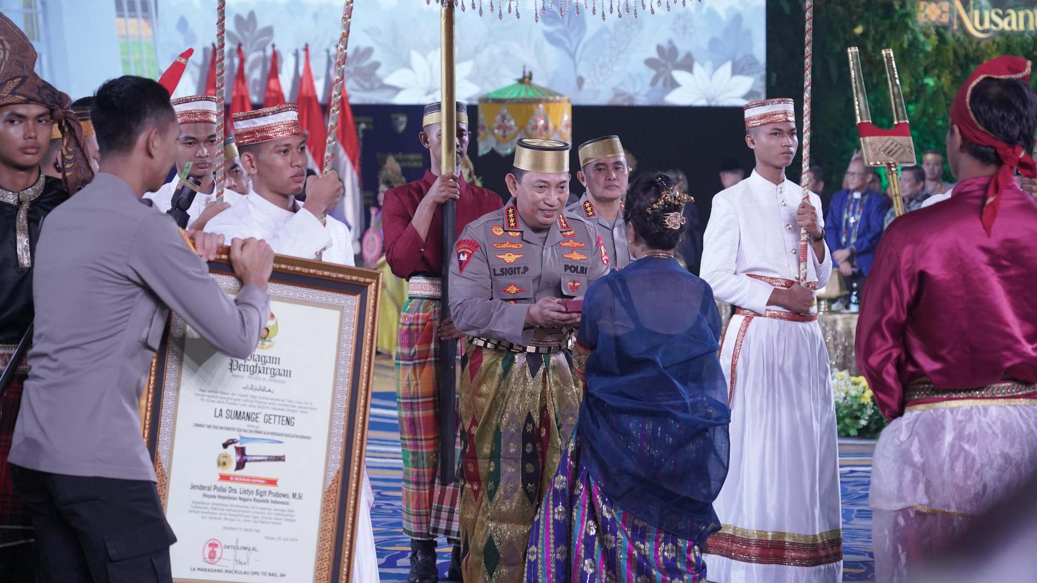 JURNALPOLRI.MY.ID, Makassar – Kapolri Jenderal Listyo Sigit Prabowo dianugerahi gelar Raja atau Karaeng dan Pusaka Supakala dari Dewan Adat dan Kerajaan di Sulawesi Selatan (Sulsel). Penghargaan diberikan berbarengan dengan kegiatan pembukaan Rakernis Baharkam Polri, di Ballroom Hotel Four Points by Sheraton Makassar, Sulsel, Rabu (5/6/2024).