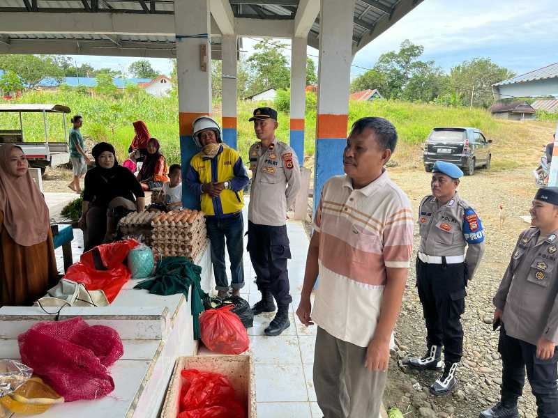 Dari kios ke kios, IPDA Sakaria berbincang langsung dengan para pedagang dan pembeli, menanyakan harga beras, minyak goreng, gula, hingga kebutuhan pokok lainnya.