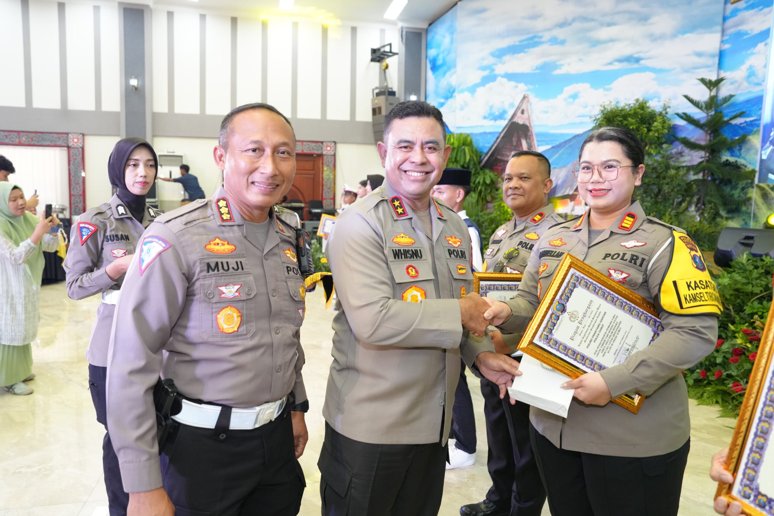JP. PEMATANG SIANTAR-SUMATERA UTARA. Kasat Lantas Polres Pematangsiantar AKP Gabriellah Angelia Gultom, S.I.K., M.H menerima piagam penghargaan dari Kapolda Sumatera Utara (Sumut) Irjen Pol. Irjen Pol Whisnu Hermawan Februanto, S.I.K., M.H didampingi Dir Lantas Polda Sumut Muji Ediyanto, S.H, S.I.K, M.A.P dalam rangka Acara Syukuran Hari Lalulintas Bhayangkara ke – 69 Tahun 2024 bertempat di Aula Tribrata Polda Sumut, pada hari Rabu 25 September 2024 Pada pukul 10.00 Wib.