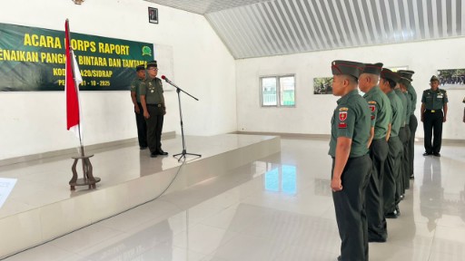 Sidrap, JURNALPOLRI.MY.ID – Mayor Inf Wahyudi, S.E., Kasdim (Kepala Staf Kodim) 1420/Sidrap, Wakili Dandim 1420/Sidrap Letkol Inf Awaloeddin, S.I.P. memimpin langsung Acara Korp Raport Kenaikan Pangkat Bintara dan Tamtama Kodim 1420/Sidrap periode 01 Oktober 2025. Sebanyak 23 personel menerima kenaikan pangkat setingkat lebih tinggi dalam upacara yang berlangsung khidmat di aula Makodim 1420/Sidrap, Jl. Jend. Sudirman, Kel. Majalling Wattang, Kec. Maritangngae, Kabupaten Sidrap, pada hari Rabu, 01 Oktober 2025.