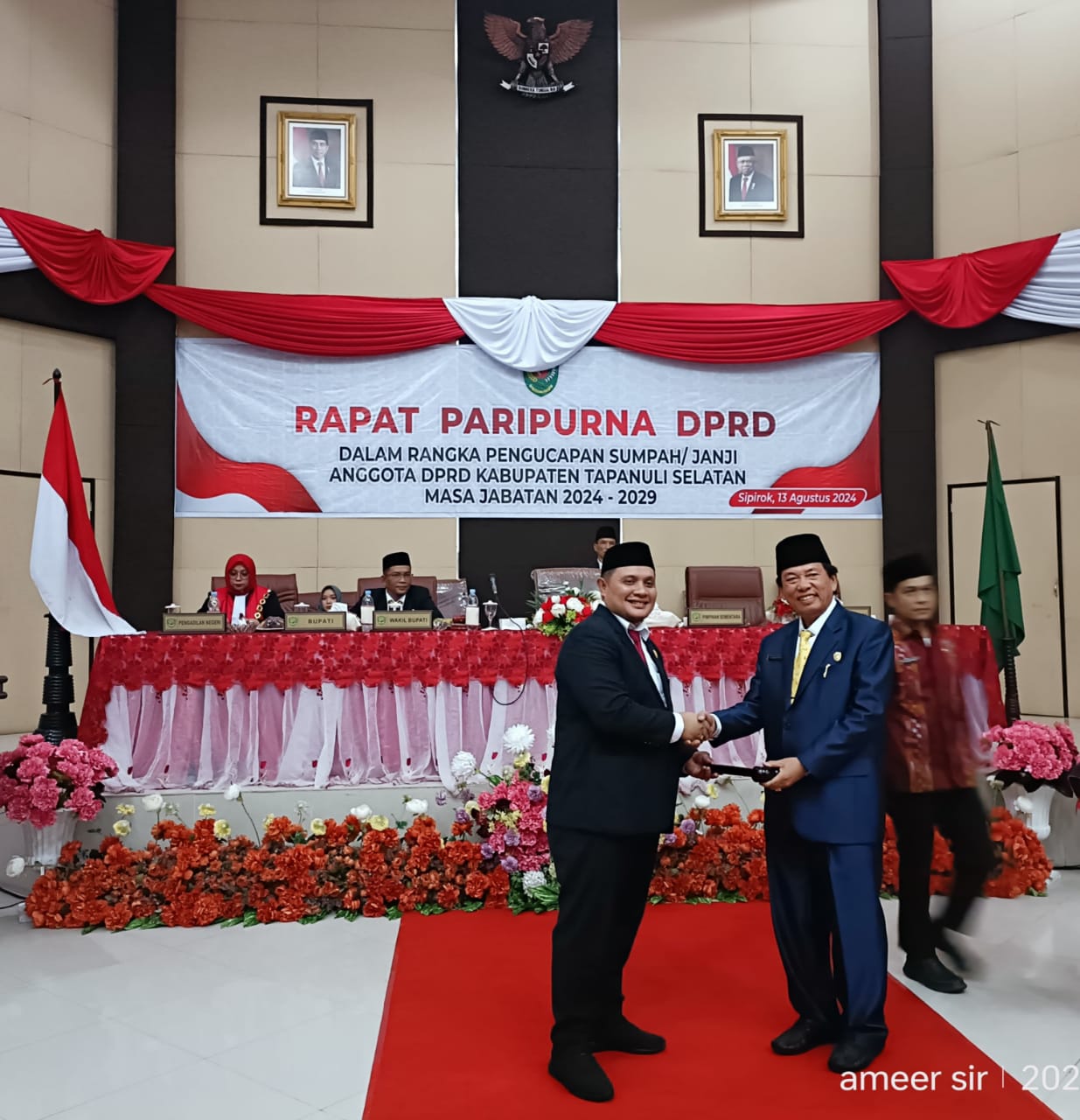 JP. Tapsel Sipirok// 35 Anggota DPRD Kabupaten Tapanuli Selatan (Tapsel) terpilih periode 2024-2029 resmi dilantik oleh ketua pengadilan Negeri padang sidempuan dan di ambil sumpah/janji pada Rapat Paripurna DPRD di Ruang paripurna Gedung dewan perkantoran sipirok,pada hari ini Selasa(13/08/24).