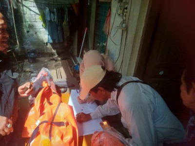 Proses pembagian bantuan berlangsung tertib. Para penerima bantuan secara bergantian melakukan pencatatan administrasi sebelum menerima paket sembako yang telah disiapkan oleh panitia.