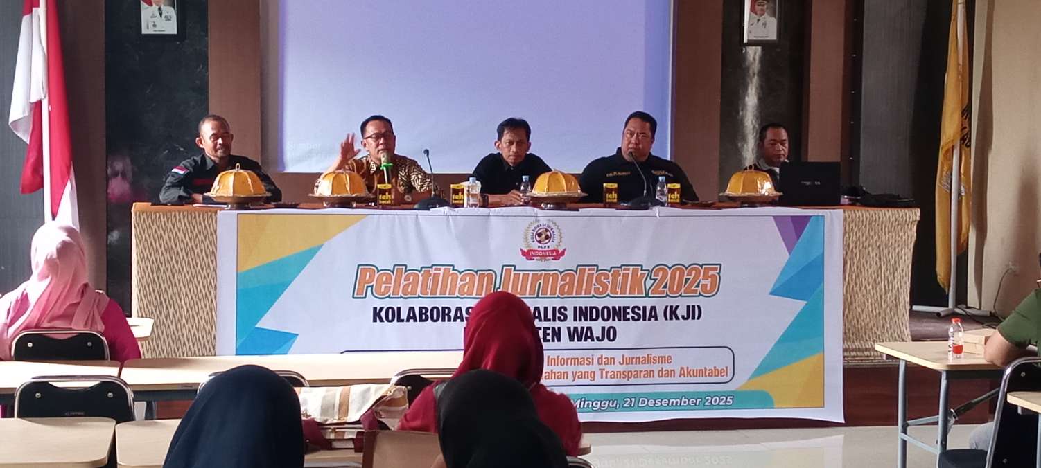WAJO, JURNALPOLRI.MY.ID – Kolaborasi Jurnalis Indonesia (KJI) Kabupaten Wajo di bawah kepemimpinan Takbir, menggelar pelatihan jurnalistik di Aula Inspektorat Kabupaten Wajo, Minggu (21/12/2025).
