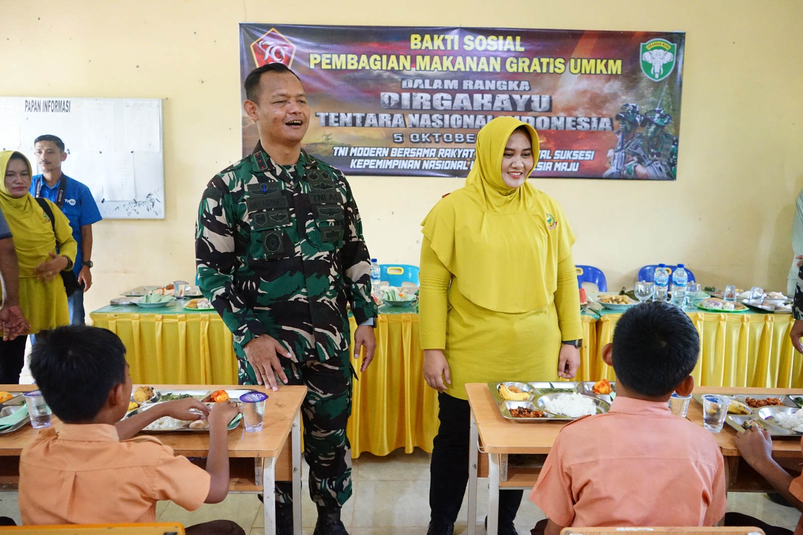 Komandan Kodim 0117/Aceh Tamiang Letkol Inf Andi Ariyanto, SIP, MIP., di dampingi Ketua Persit KCK Cabang XXIV Kodim 0117/Aceh Tamiang Ny. Pratiwi Andi Ariyanto, memberikan makan siang gratis bagi para siswa dan siswi di salah satu sekolah dasar di pedalaman kabupaten aceh tamiang bertempat di SD Negeri Sulum. pemberian makan siang gratis ini dalam rangka menyambut HUT TNI Ke – 79.