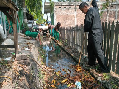Personel Kodim 1420 Sidrap melaksanakan kerja bakti membersihkan saluran air di sekitar Asrama Makodim untuk menjaga kebersihan dan mencegah banjir.