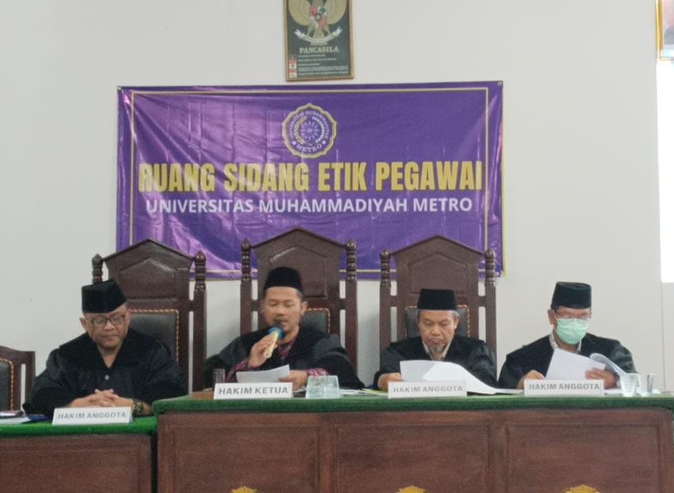 Komite Etik Hakim adhock Universitas Muhammadiyah Metro menggelar sidang perdana dugaan Pelangaran kode etik oknum SY pejabat rektorat universitas Muhammadiyah Metro dan oknum staf MDL. Keduanya diduga dipersangkaan melakukan perbuatan yang dinilai melanggar norma agama dan norma etika dan moralitas prilaku seorang pegawai universitas Muhammadiyah Metro. Hal itu dikatakan juru bicara Rektor universitas Muhammadiyah Metro Asst.Prof.Dr.Edi Ribut Harwanto SHMH di Fakultas Hukum UM Metro saat dikonsfirmasi wartawan tadi siang tadi Rabu (6-11).