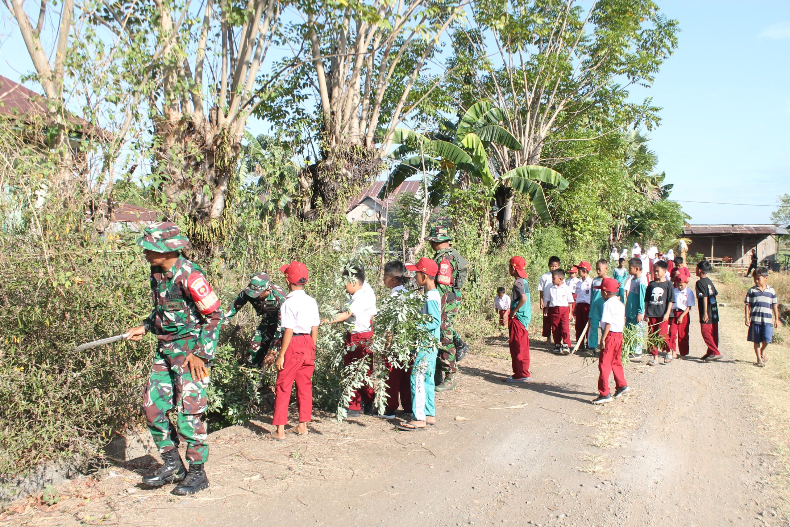 Saat melaksanakan kerja bakti terlihat siswa dengan penuh semangat bersama anggota Koramil 1426-01/Polut saling bahu membahu membersihkan lingkungan sekolah dan saluran air agar terlihat lebih bersih dan indah.