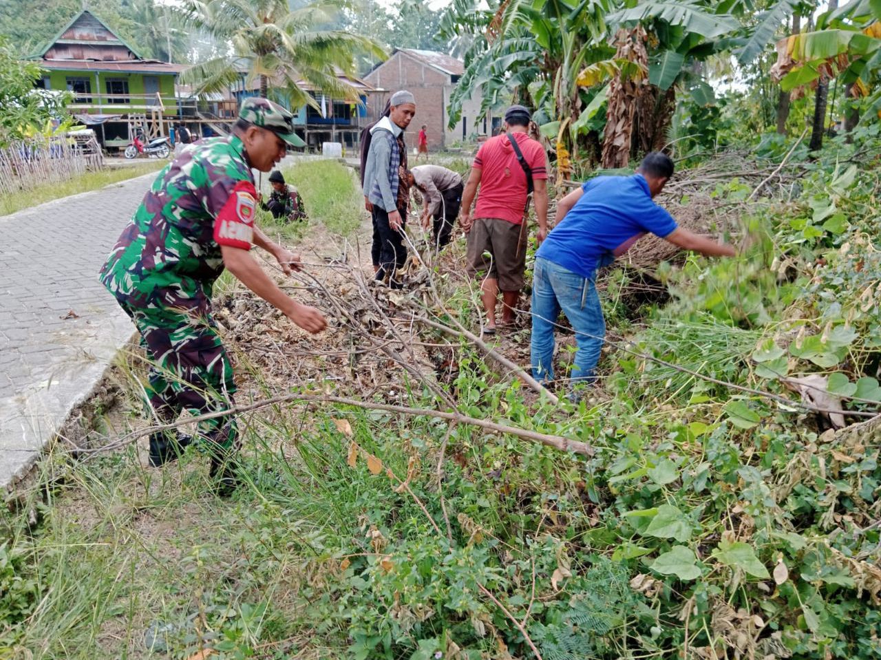 Anggota Koramil 06/Mapsu bersama warga tampak kompak bahu-membahu membersihkan saluran air yang tertutup oleh sampah dan lumpur serta semak belukar sehingga menggangu aliran air tidak lancar.