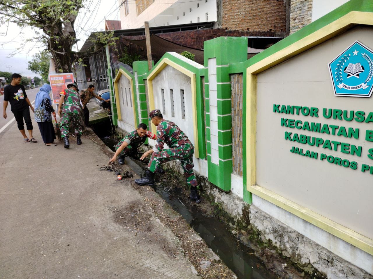 Dengan menggunakan alat korvey seperti sapu, cangkul dan sekop para Babinsa bersama Pegawai KUA membersihkan halaman Kantor KUA serta saluran air disekeliling kantor sebagai langkah dalam pencegahan wabah penyakit.