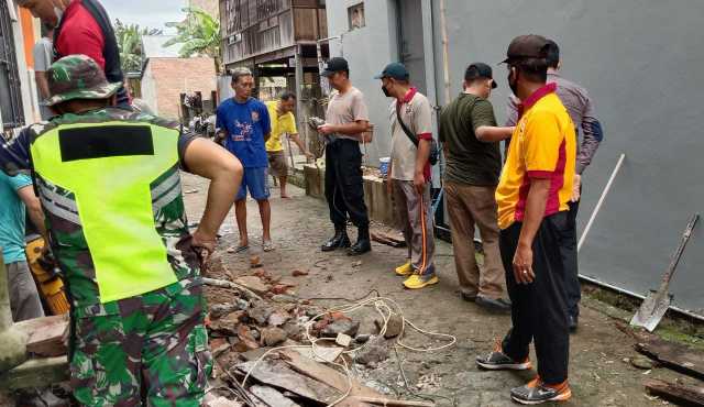 Dengan alat sederhana—cangkul, sekop, dan karung—anggota Koramil dan warga bahu-membahu mengangkat lumpur dan sampah yang menyumbat saluran air.