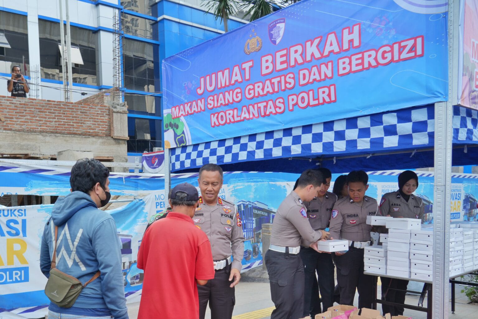 Korlantas Polri kembali menunjukkan kepedulian terhadap masyarakat dengan menggelar kegiatan Jumat Berkah, yakni membagikan makan siang gratis dan bergizi di depan Gedung Korlantas Polri, Jumat (25/10/2024).