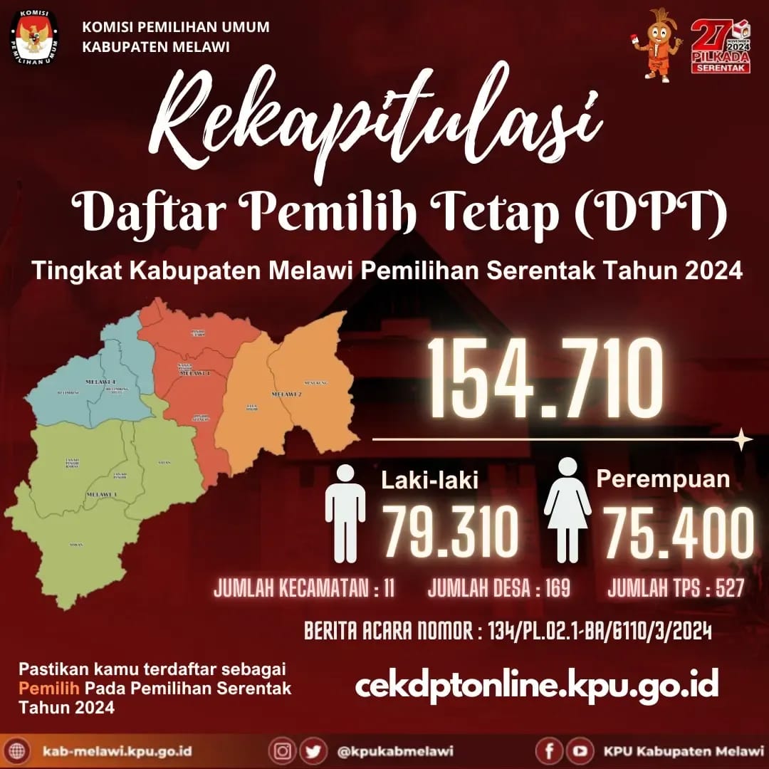 Komisi Pemilihan Umum (KPU) Kabupaten Melawi telah merampungkan dan menyampaikan Rekapitulasi Daftar Pemilih Tetap (DPT) untuk Pemilihan Gubernur dan Wakil Gubernur Kalimantan Barat serta Pemilihan Bupati dan Wakil Bupati Melawi pada Pemilihan Serentak 2024. Rekapitulasi ini menjadi dasar penting dalam memastikan bahwa seluruh warga yang memenuhi syarat telah terdata sebagai pemilih dalam pesta demokrasi mendatang.