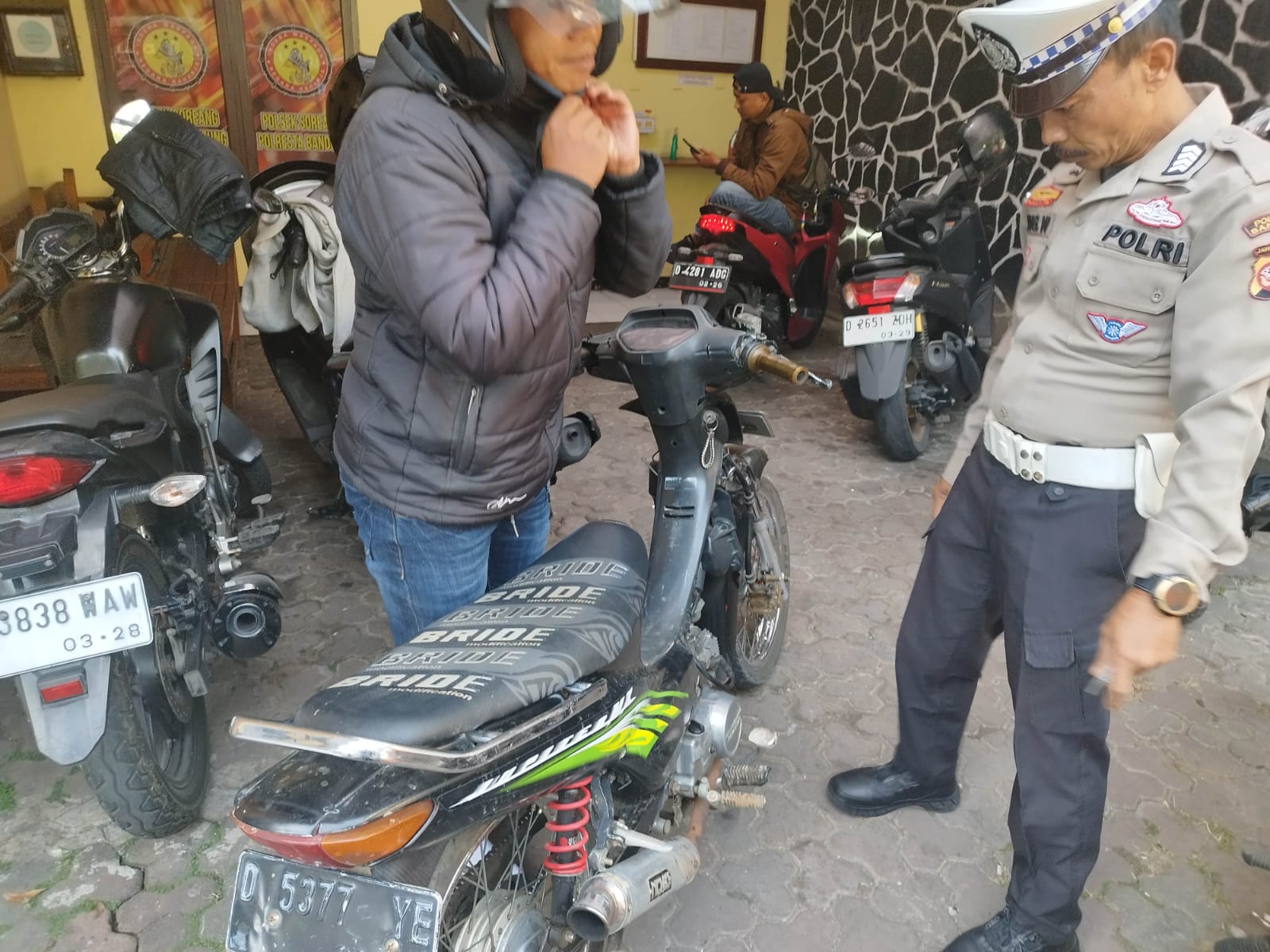 Sepeda motor untuk sementara ditahan hingga pengendara mengganti knalpot sepeda motor sesuai spesifikasi teknis. Kapolresta Bandung Kombes Pol. Dr. Kusworo Wibowo, S.H., S.I.K., M.H. melalui Kapolsek Soreang Kompol Ivan Taufiq, S.H, mengatakan razia penindakan knalpot brong sudah dilakukan selama beberapa waktu terakhir oleh unit lantas dibantu piket fungsi .