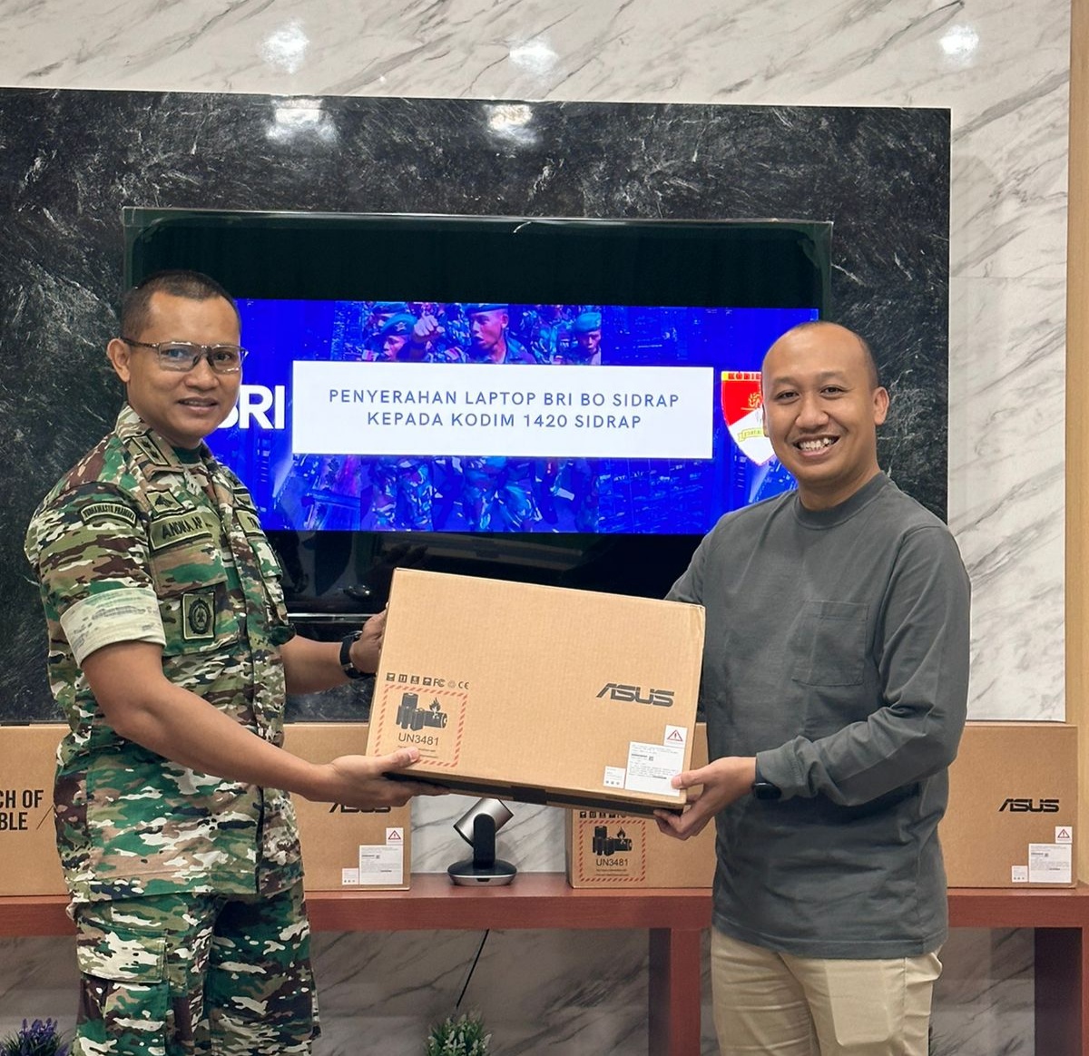 Laptop-laptop tersebut diserahkan langsung oleh Branch Manager BRI Sidenreng Rappang, Sudadi, kepada Dandim 1420/Sidrap, Letkol Inf Andika Ari Prihantoro, SE., M.I.Pol.
