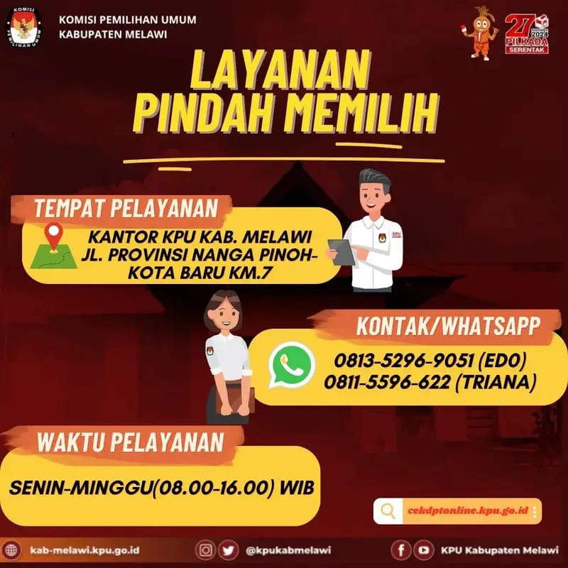 “Kami menyediakan layanan pindah memilih bagi masyarakat yang berada di luar tempat tinggalnya. Selain itu pemilih juga bisa langsung datang ke Kantor KPU Melawi di Jl. Provinsi Nanga Pinoh – Kota Baru KM 7, atau menghubungi nomor kontak yang tertera pada pamflet resmi kami,” kata Ketua KPU Kabupaten Melawi, Irfan Affandi.
