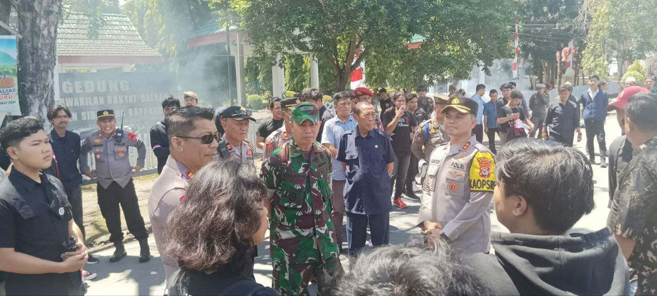 Namun, dalam hiruk-pikuk aksi yang memanas, sosok Letkol Inf. Awaloeddin, S.I.P., Dandim 1420/Sidrap, muncul sebagai penengah. Beliau turun langsung ke lapangan, bukan hanya untuk mengamankan, tetapi juga menenangkan massa. Kehadiran Dandim ini membawa angin sejuk di tengah kerumunan, mengubah suasana yang awalnya tegang menjadi lebih kondusif. “Kami mendengar dan memahami aspirasi kalian. Mari kita jaga ketertiban bersama,” ucap Awaloeddin dengan nada yang menenangkan, mencairkan ketegangan di antara para demonstran.