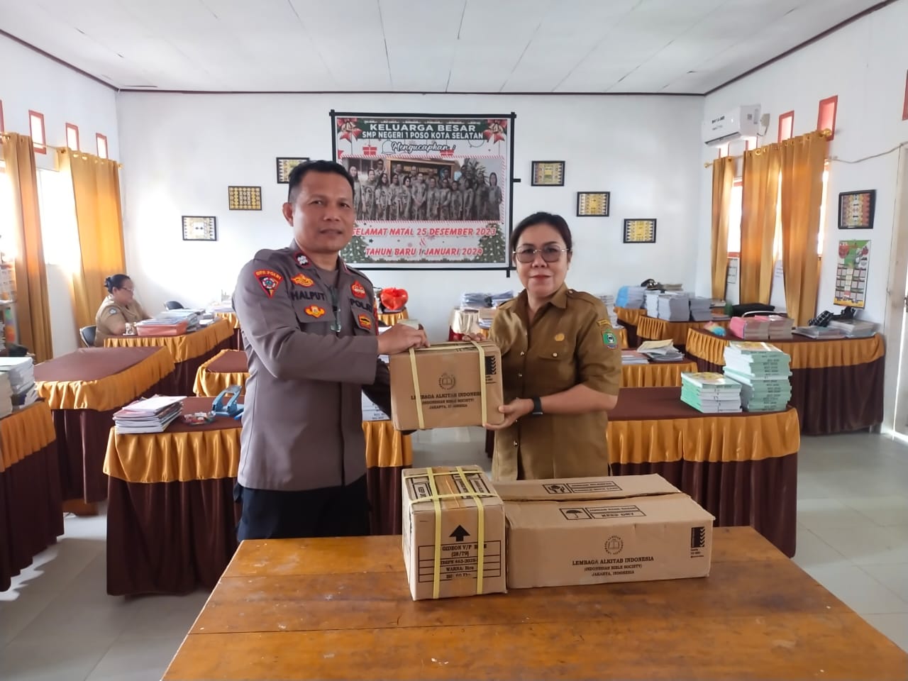 Setelah kegiatan di TK, Rohaniawan Polri Aiptu Halput melanjutkan silaturahmi dengan memberikan Alkitab kepada pelajar di SMP N 1 Poso Kota Selatan. Penyerahan Alkitab ini diterima langsung oleh Ibu Treis Mowendu, selaku Kepala Sekolah SMP N 1. Aiptu Halput berharap, pemberian Alkitab dapat meningkatkan minat baca di kalangan pelajar Kristen.