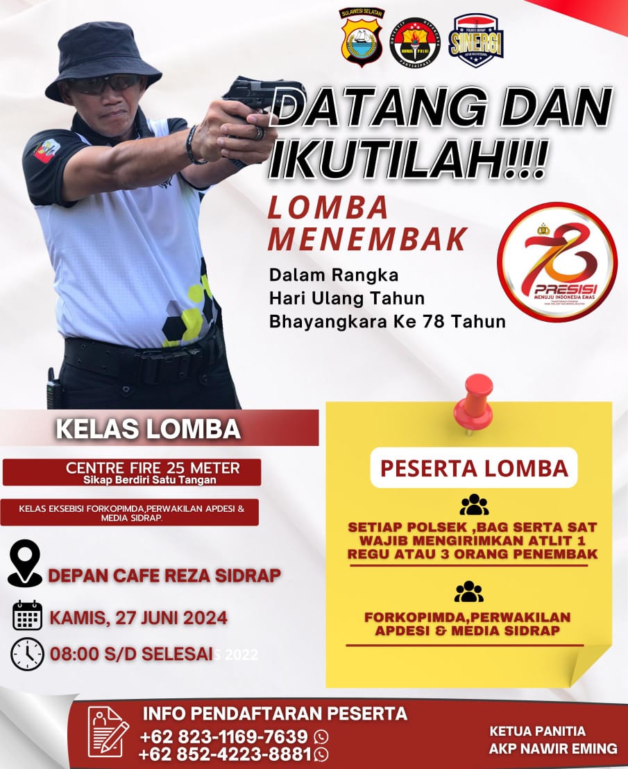 JURNALPOLRI.MY.ID, Sidrap – Dalam rangka memperingati Hari Ulang Tahun (HUT) Bhayangkara ke-78, Kepolisian Resor (Polres) Sidrap Polda Sulawesi Selatan (Sulsel) siap menggelar lomba menembak khusus bagi anggotanya. Acara yang penuh tantangan ini akan berlangsung pada tanggal 27 Juni 2024 di Lapangan Tembak Polres Sidrap, yang terletak di depan Cafe Reza, Kecamatan Watang Pulu, Kabupaten Sidrap.