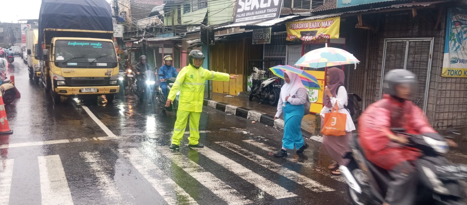 Meski di Guyur Hujan, Anggota Lantas Polsek Cileunyi tetap Eksis berikan Pelayanan kepada masyarakat