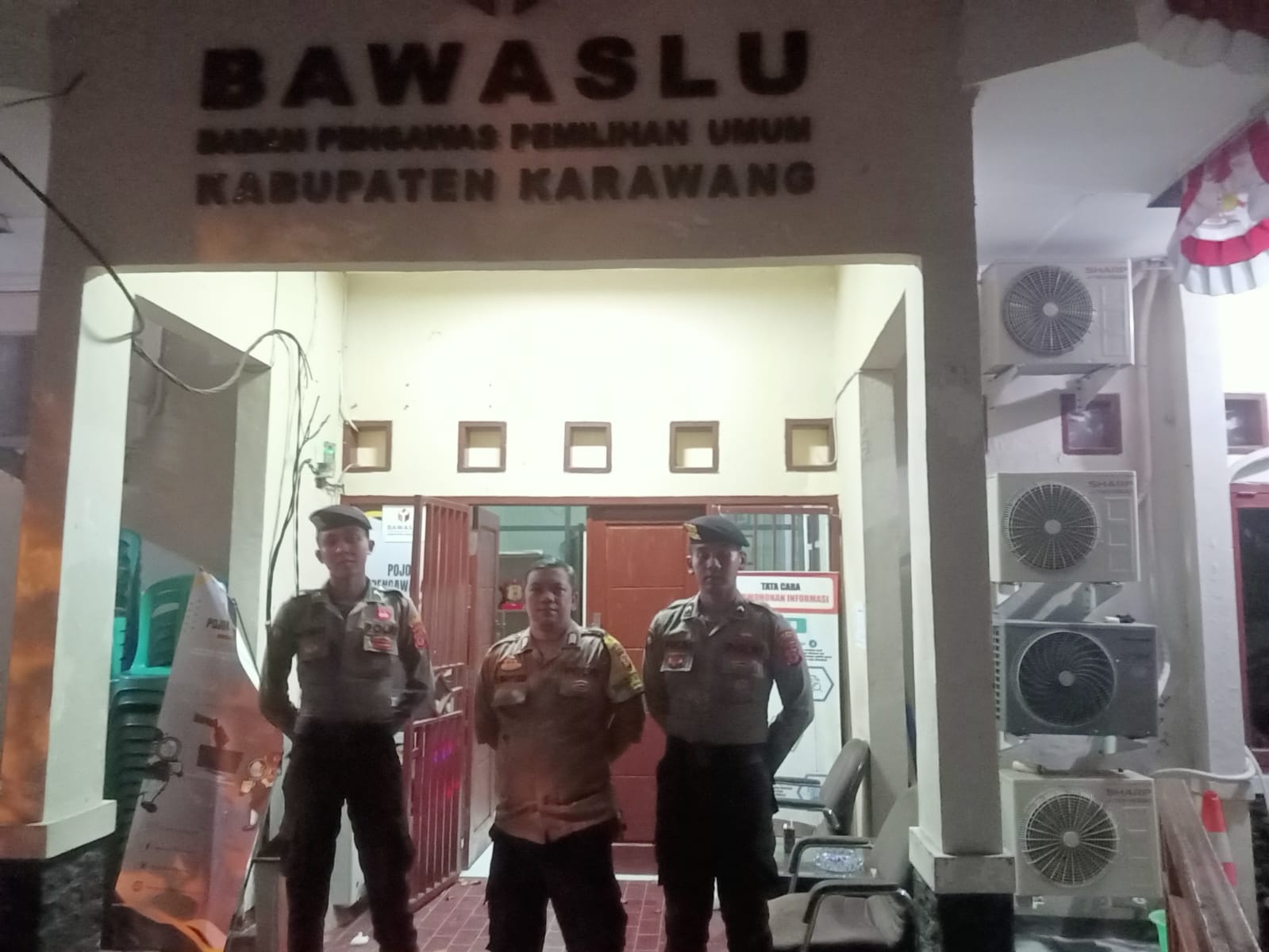 JP Polres Karawang – Padal Polsek Karawang Kota Ipda Dimas Andri Tri Kurniawan beserta anggota lainnya mengecek keamanan di Kantor Bawaslu Kabupaten Karawang dalam rangka Ops Mantap Praja. Minggu (20/10/2024).