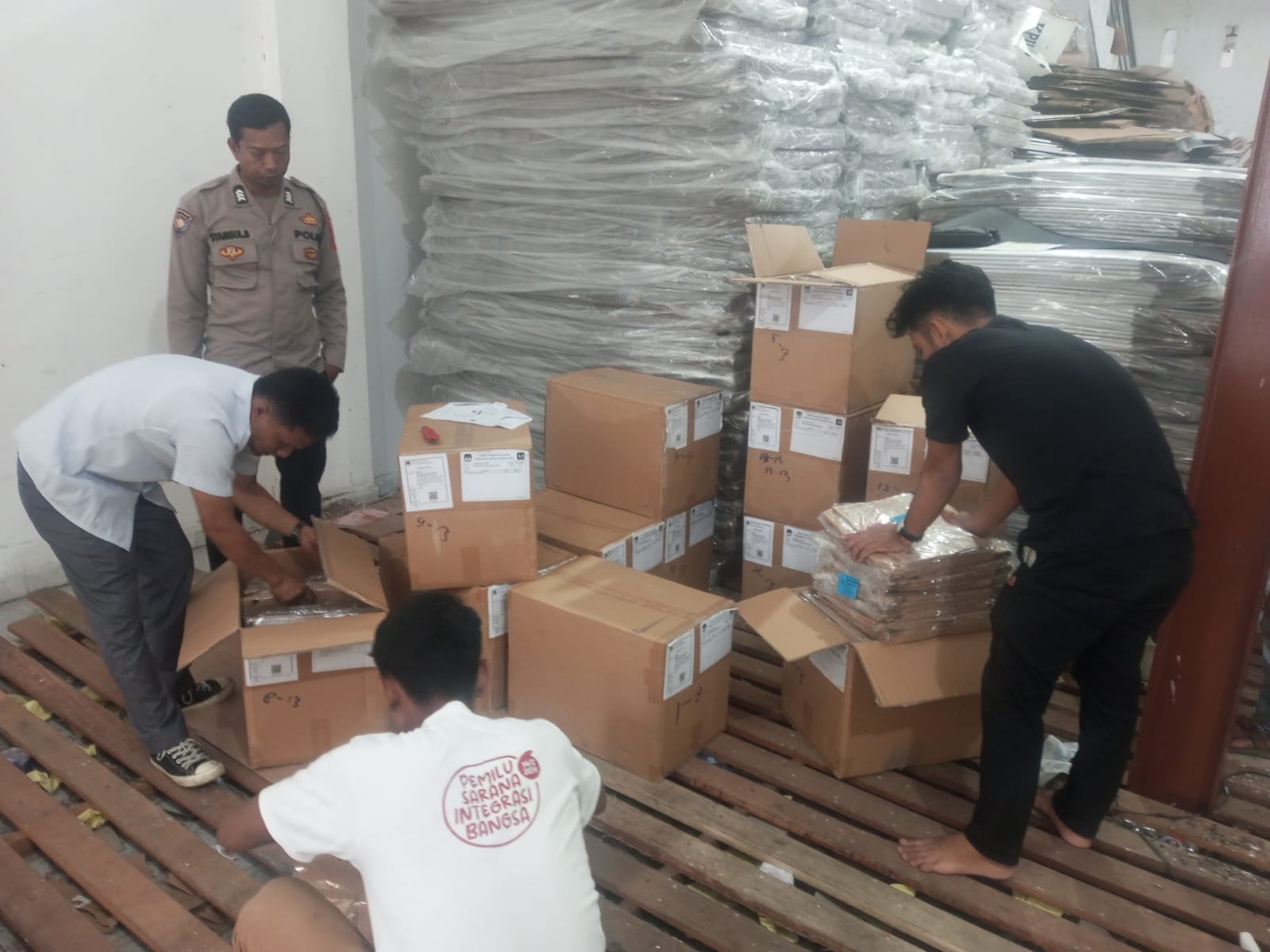 Rangkaian kegiatan pemindahan barang Logistik Pilkada tahun 2024 jenis Sampul Kubus, dari mobil pengangkutan ke Gudang KPU Kota Pematang Siantar selesai dilaksanakan, situasi aman dan baik./Humas P Siantar. (SE.Rento.S)