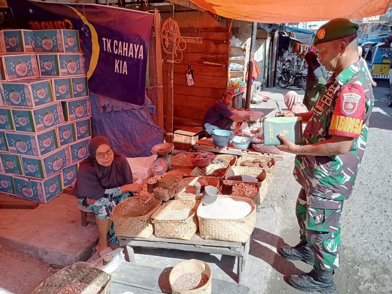 Serma Sunawar dan Serda Ali Hanapi langsung turun ke lapangan, mengecek harga berbagai kebutuhan pokok seperti beras, gula, minyak goreng, telur, cabai, dan bawang. “Perlu kita lakukan pengecekan langsung agar tidak ada pedagang yang menaikkan harga tanpa mengikuti kebijakan pemerintah,” ujar Serma Sunawar.