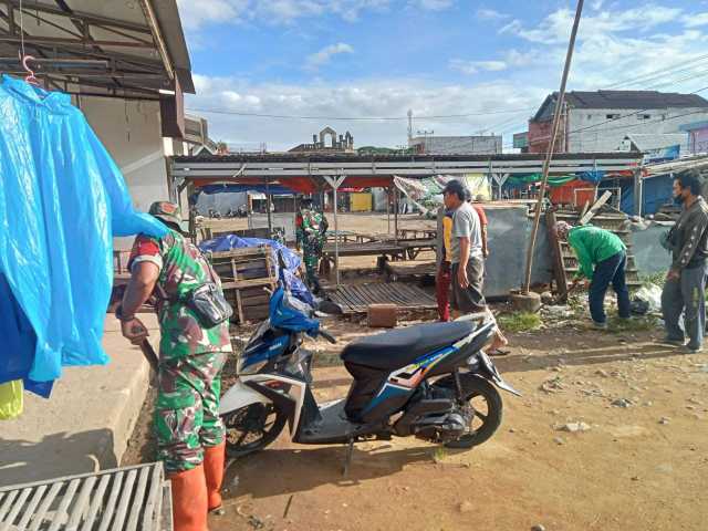 Babinsa Koramil-02/Tellu Limpoe bersama warga turun tangan membersihkan pasar, memastikan tempat ini tetap nyaman buat semua.