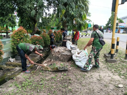 Seluruh anggota yang terlibat tampak antusias membersihkan area luar Makodim, termasuk selokan dan trotoar. Sampah dan rumput liar diangkut untuk menciptakan lingkungan yang lebih bersih dan rapi.