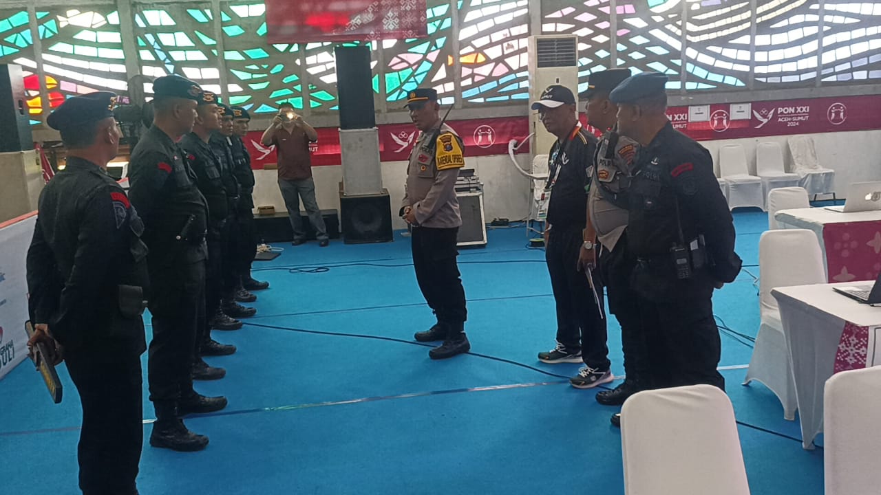 JP. PEMATANG SIANTAR-SUMATERA UTARA. Personil Pengamanan Polres Pematangsiantar bersama Tim Komposit IV Delta Detasemen Gegana Satuan Brimob Polda Sumut melaksanakan Sterilisasi Venue Cabang olahraga (Cabor) Tinju di Gedung Serbaguna Universitas HKBP Nommensen (UHKBPNP) dalam rangka PON XXI Tahun 2024 Aceh-Sumut, Selasa 10 September 2024 pukul 11.00 Wib.
