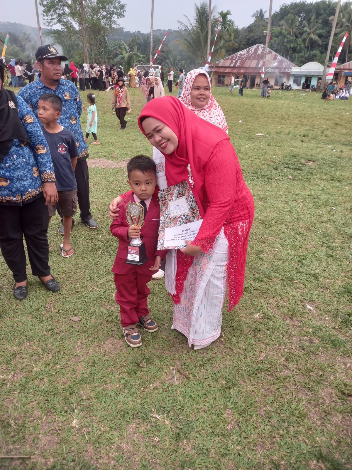 Piala juara 1 Carnaval Tema Pahlawan langsung di serahkan oleh bunda paud/Tk kecamatan Angkola Timur Ny.Nuriadori Cos Riadi Siregar.