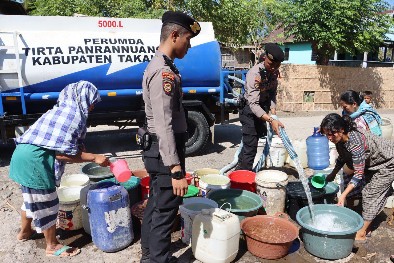Untuk mengantisipasi hal tersebut, Polres Takalar bekerjasama dengan Perumda Tirta Panrannuangku menyalurkan bantuan air bersih guna dikonsumsi bagi warga Dusun Matteke dan Dusu Lakatong yang terdampak kekeringan.