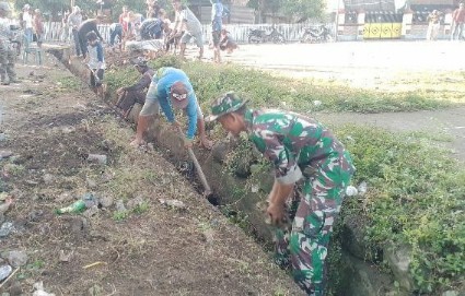 Warga bersama anggota Koramil tampak kompak bahu membahu membersihkan saluran air yang penuh ditutupi tanah lumpur dan sampah yang mengganggu aliran air tidak lancar.
