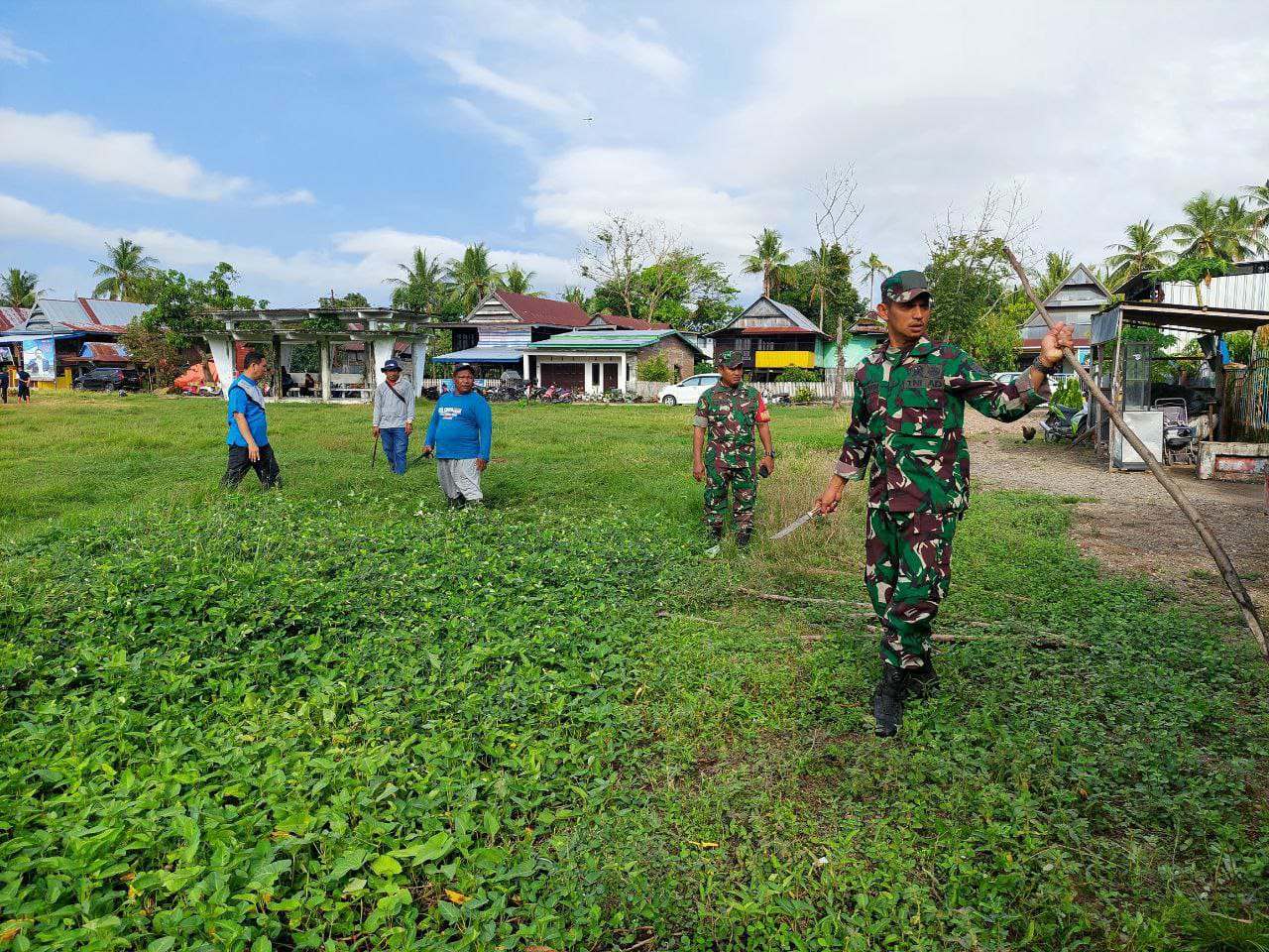 Kegiatan ini berlangsung dengan penuh semangat gotong royong, di mana setiap orang mengambil peran dalam merapikan lapangan.