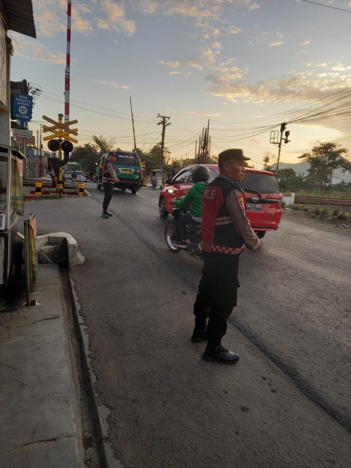 JP – Rancaekek, Personil Unit Samapta Polsek Rancaekek Polresta Bandung pelayanan pagi urai kepadatan lalu lintas di sekitar Pintu Pelintasan Kereta Api. Senin 09/09/2024