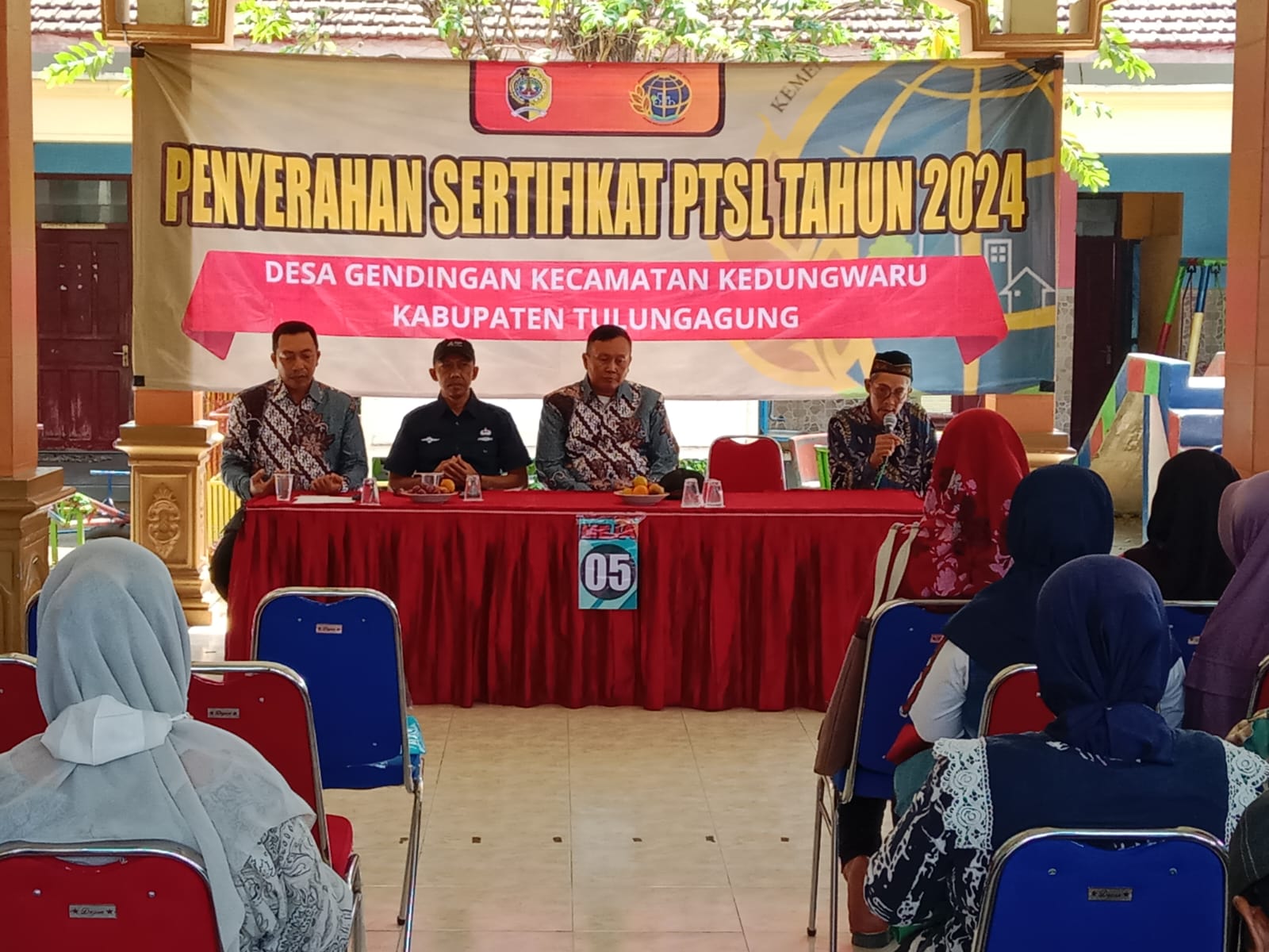 Pemerintah Desa Gendingan ,Kecamatan Kedungwaru, Kabupaten Tulungagung melaksanakan penyerahan sertifikat Pendaftaran Tanah Sistematis Lengkap (PTSL) kepada warga Desa Gendingan berlangsung lancar dan sukses.Sabtu, (19/10/2024) bertempat di balai desa setempat.