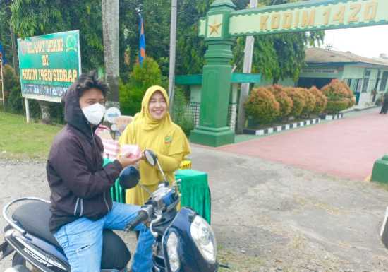 Di depan Makodim 1420/Sidrap, sekelompok ibu-ibu berbaju hijau terlihat membagikan sesuatu kepada pengendara yang melintas.