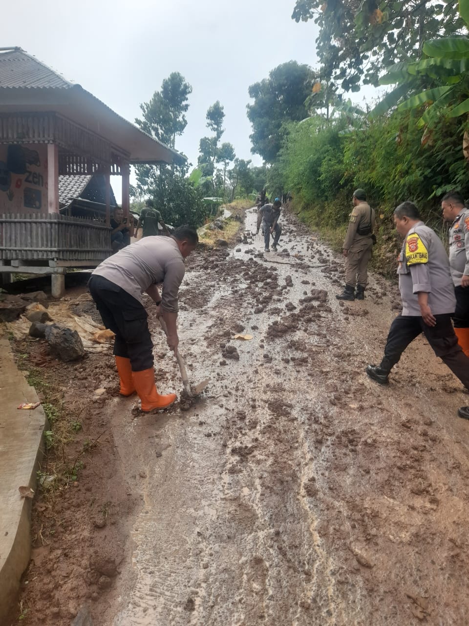 Guna membuka akses jalan yang tertutup akibat longsor, petugas gabungan pun membersihkan material tanah dengan alat seadanya.