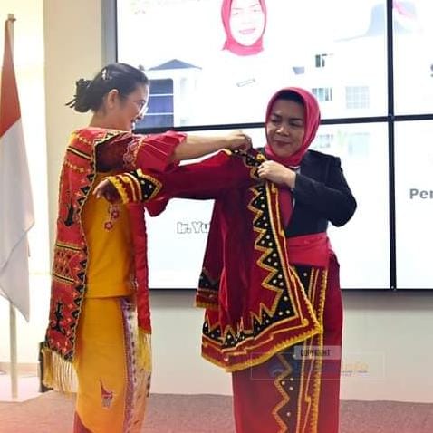 Sambutan ini ditandai dengan Penyematan Baju Adat Nias kepada PJs Bupati Nias, Ibu Ir. Yuliani Siregar, M.AP oleh Ibu Ketua DWP Kabupaten Nias yang disertai dengan Foto Bersama.