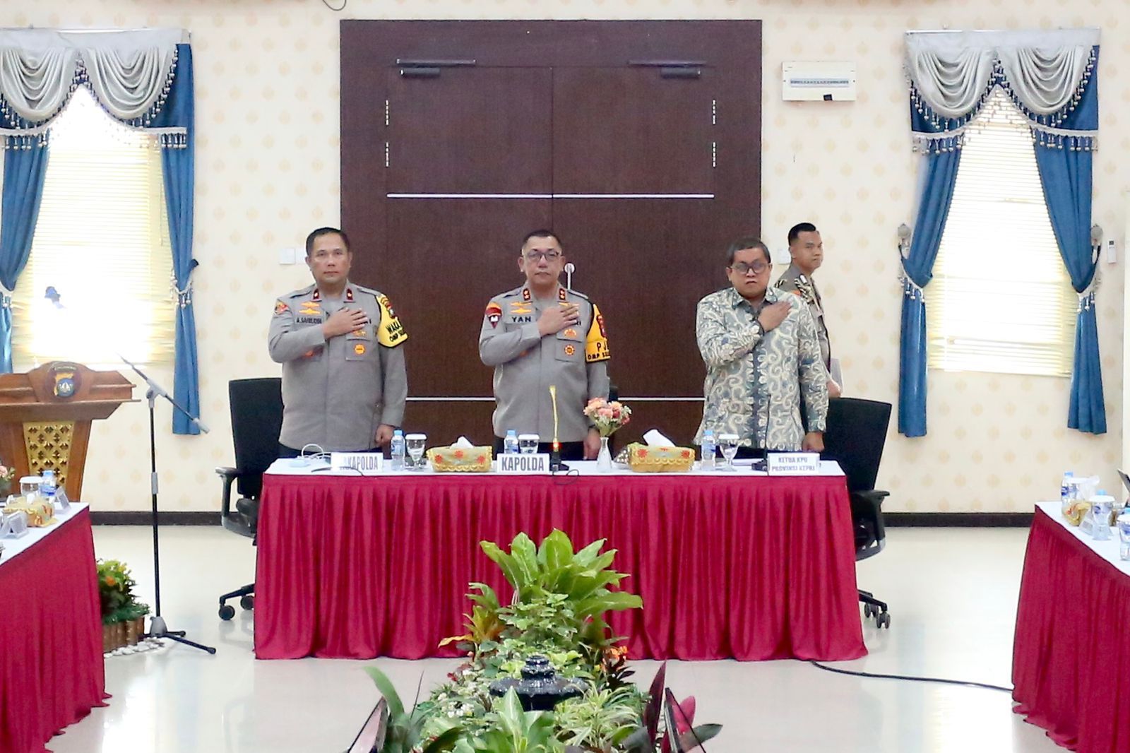 Hadir dalam rapat tersebut Kapolda Kepri Irjen. Pol. Drs. Yan Fitri Halimansyah, M.H., Wakapolda Kepri, Ketua KPU Provinsi Kepulauan Riau, perwakilan dari Bawaslu, pejabat utama Polda Kepri, Kasiops Korem 033/WP, serta jajaran Kapolres dan Kasubsatgas Operasi Mantap Praja 2024.