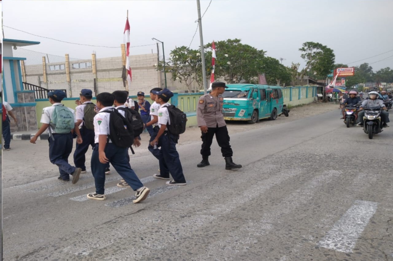 JP Polres Karawang – Bhabinkamtibmas Polsek Pangkalan Aipda Abdul Hoer dan Bripka Indra Lesmana melaksanakan pengaturan lalu lintas sekaligus bantu pelajar menyeberang jalan di depan SMPN 1 Pangkalan, Kabupaten Karawang, Jawa Barat, Jumat (11/10/2024).