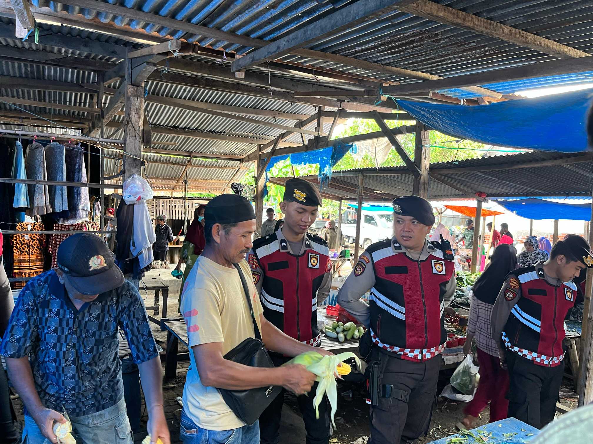 Di antara hiruk-pikuk pedagang dan pembeli, tampak sekelompok polisi berseragam lengkap menyusuri lorong-lorong pasar.