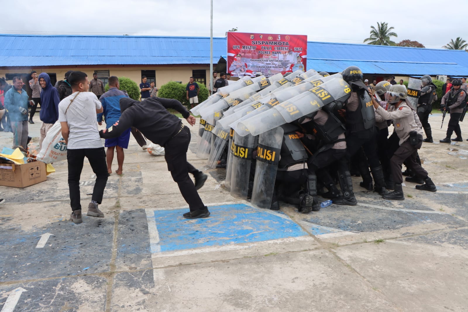 Kegiatan simulasi diawali dengan massa yang kurang lebih 50 orang ingin bertemu Ketua KPU kabupaten Mappi untuk menyampaikan aspirasi dan meminta kejelasan tentang adanya kecurangan dalam pilkada. Saat bertemu dengan Ketua KPU massa tidak puas denga penjelasan yang diberikan oleh ketua KPU sehingga massa melakukan tindakan anarkis dengan membakar ban dan melakukan pengrusakan fasilitas umum. Selanjutnya pasukan pengendali massa Polres Mappi melakukan blokade dan memukul mundur massa yang saat itu sudah anarkis.