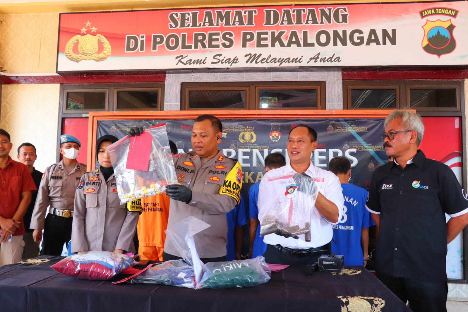 Selain menangkap tersangka Polres Pekalongan juga berhasil mengamankan beberapa barang bukti, diantaranya KBM pick up, perlengkapan-perlengkapan pemindahan, 41 tabung gas kosong ukuran 3 kg, 14 tabung gas isi ukuran 3 kg, 13 tabung gas kosong ukuran 5,5 kg warna pink, 32 tabung gas kosong ukuran 12 kg warna pink, oplosan 20 tabung gas isi ukuran 12 kg warna pink dan satu tabung gas kosong ukuran 50 warna orange.