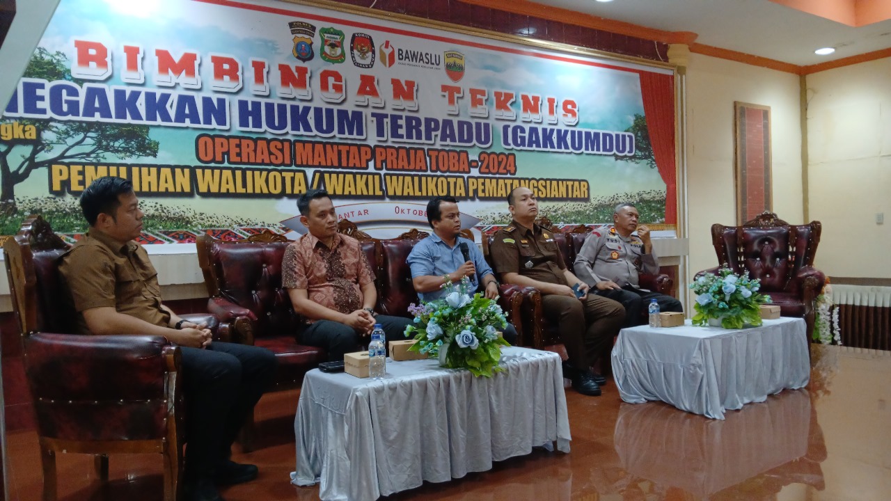 JP. PEMATANG SIANTAR-SUMATERA UTARA. Wakapolres Pematangsiantar AKBP Ahmad Wahyudi mewakili Kapolres melaksanakan kegiatan Bimbingan Teknis (Bimtek) Penegakan Hukum Terpadu (Gakkumdu) Pemilihan Walikota/wakil Walikota Pematangsiantar dalam rangka Operasi Mantap Praja Toba Tahun 2024.