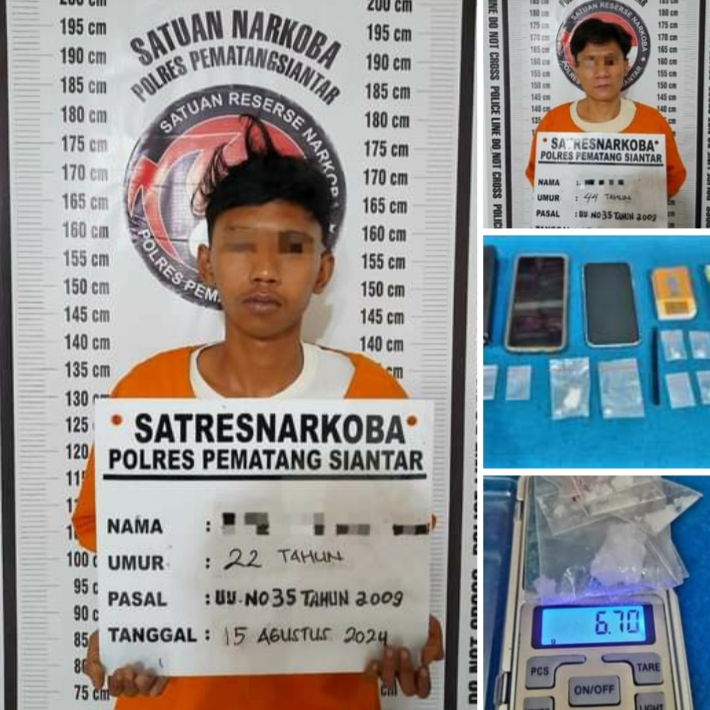 Kapolres Pematangsiantar AKBP Yogen Heroes Baruno SH, SIK melalui Kasat Resnarkoba AKP JH. Pasaribu SH, MH pada hari Minggu 18 Agustus 2024 mengatakan kedua tersangkan itu berinisial JR (44) warga Jalan Medan KM.10,5 Gang Melati Lk.6 Kelurahan Sinaksak Kecamatan Tapian Dolok Kab. Simalungun dan DWS (22) warga Beringin Jalan Medan Lk.7 Kelurahan Sinaksak Kecamatan Tapian Dolok Kabupaten Simalungun.