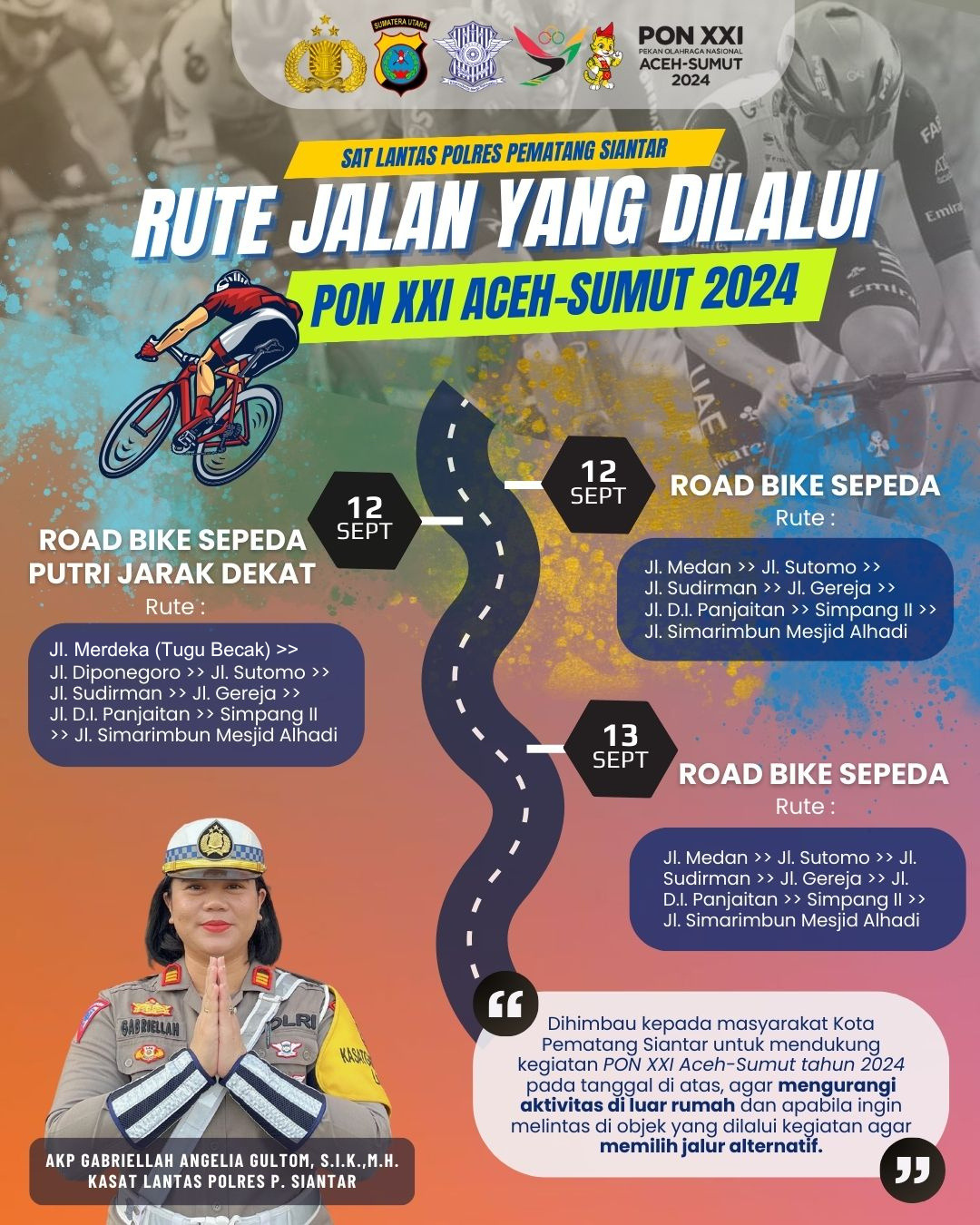 “Sehubungan dengan kegiatan road bike (balap sepeda) PON XXI Tahun 2024 Aceh – Sumut dengan finish di Pantai Bebas Parapat, maka Polres Pematangsiantar akan terlibat sebagai jalur perlintasan dan titik start atlet putri jarak dekat. Dengan demikian akan dilakukan rekayasa lalu lintas,” kata Kapolres Pematangsiantar, AKBP Yogen Heroes Baruno SH., SIK. melalui Kasat Lantas, AKP Gabriellah Gultom, SIK., MH., (Minggu 01, September 2024).