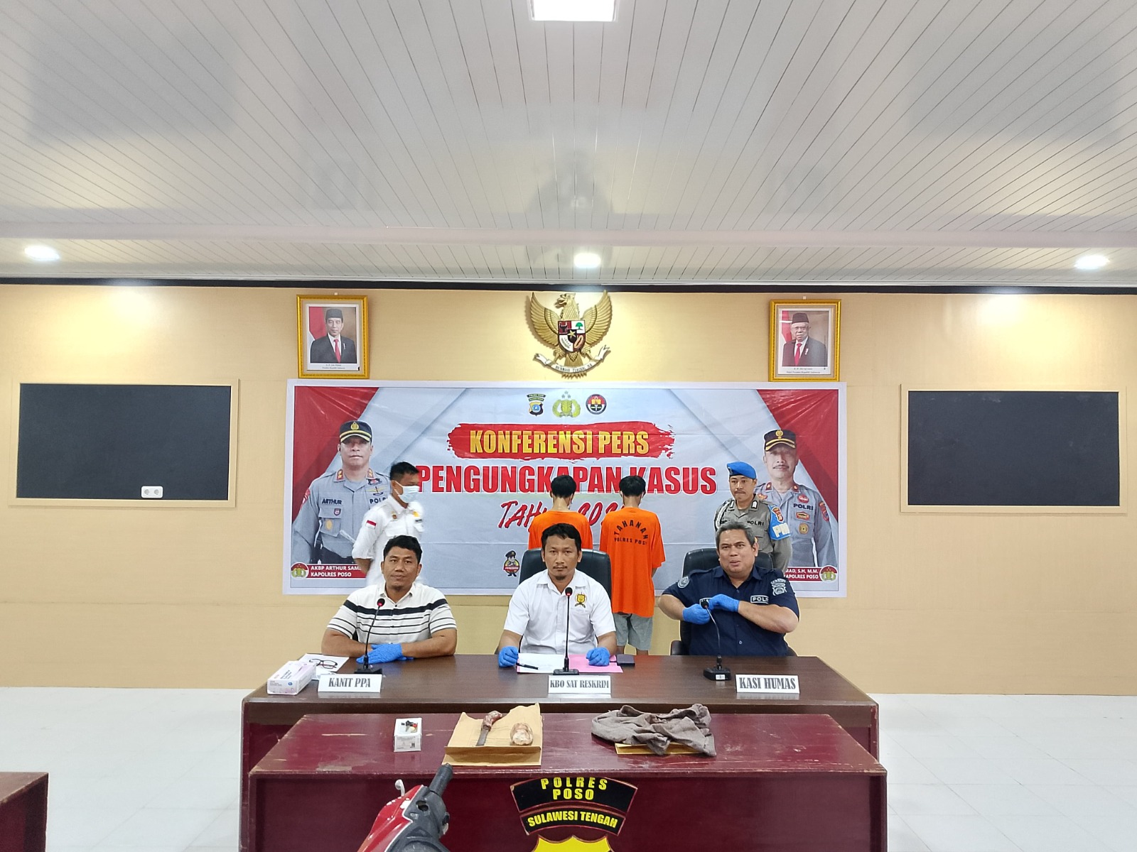 Konferensi pers ini dipimpin oleh KASI HUMAS Polres Poso AKP. Basirun Laele, S.Sos, bersama KBO Sat Reskrim Ipda Habibi Gase, SH, didampingi Kanit PPA Aiptu Indra, SH. Acara tersebut berlangsung di Aula Andisapa Sudirman, Polres Poso.