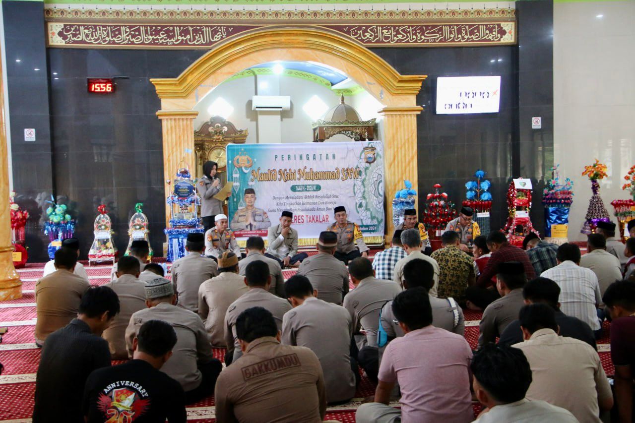 Kapolres Takalar AKBP Gotam Hidayat, S.I.K., M.Si, dalam sambutannya menekankan pentingnya meneladani sifat-sifat Nabi Muhammad SAW dalam menjalani tugas sebagai anggota Polri.